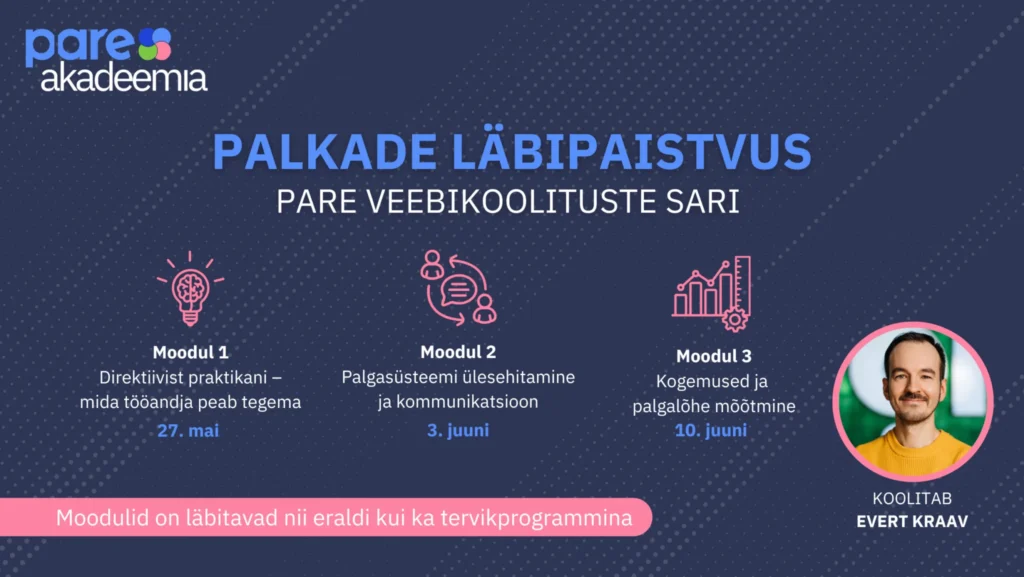 Et aidata organisatsioonidel sõltumata suurusest õigel ajal valmistuda, pakub PARE Akadeemia koostöös Bolti tasustamise juhi Evert Kraaviga kolmeosalist veebikoolituste sarja. Koolitused annavad vajalikud teadmised ja tööriistad, et luua läbipaistev ning konkurentsivõimeline tasusüsteem, mis toetab nii töötajaid kui ka organisatsiooni arengut.